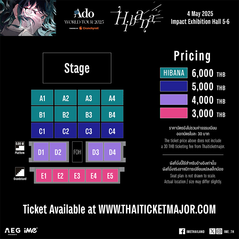 แล้วมาร่วมเป็นส่วนหนึ่งของประสบการณ์ที่ยิ่งใหญ่ในงาน Ado WORLD TOUR 2025 “Hibana” Powered by Crunchyroll in BANGKOK พร้อมมาร่วมสัมผัสความสนุกไปด้วยกันกับ Ado ที่งานนี้ ในวันอาทิตย์ที่ 4 พฤษภาคม 2568 ที่ อิมแพ็ค เอ็กซิบิชั่น ฮอลล์ 5-6 บัตรราคา HIBANA 6,000 / CAT2 5,000 / CAT3 4,000 และ CAT4 3,000 บาท (บัตรนั่งทุกที่นั่ง) สามารถซื้อบัตรได้ผ่านทาง เคาน์เตอร์ไทยทิคเก็ตเมเจอร์ ทุกสาขา หรือ www.thaiticketmajor.com และ Call Center 02-262-3456 หรือติดตามรายละเอียดงานอื่นๆ เพิ่มเติมได้ที่ Facebook @imethailand, IG และ Twitter @ime_th