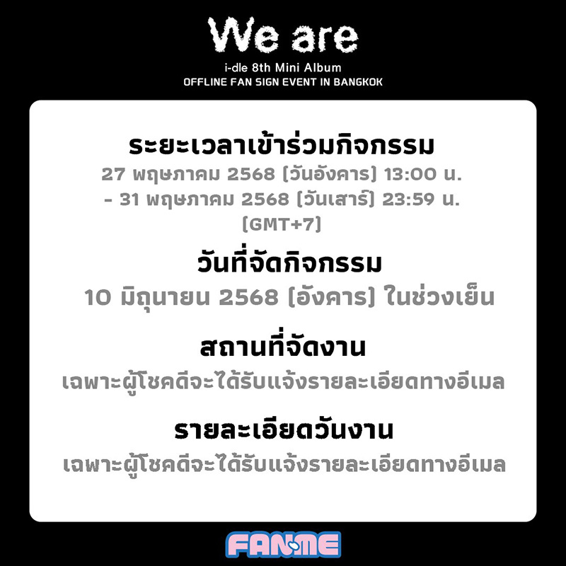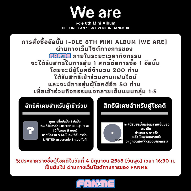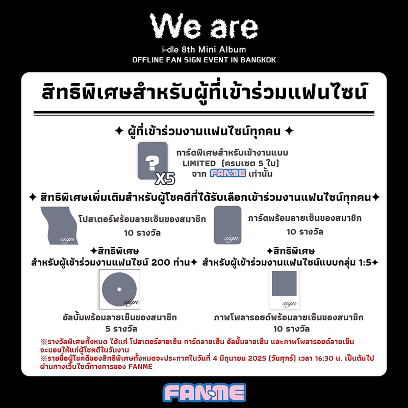 โดยจะประกาศผลผู้โชคดีเข้าร่วมงานแฟนไซน์และสิทธิพิเศษต่างๆ วันที่ 4 มิถุนายน 2568 เวลา 16.30 น. เป็นต้นไป ทาง https://fanmeofficialth.com/ และติดตามรายละเอียดเพิ่มเติมได้ที่ FB และ IG : @FANME Thailand และ X : @Fanme_th