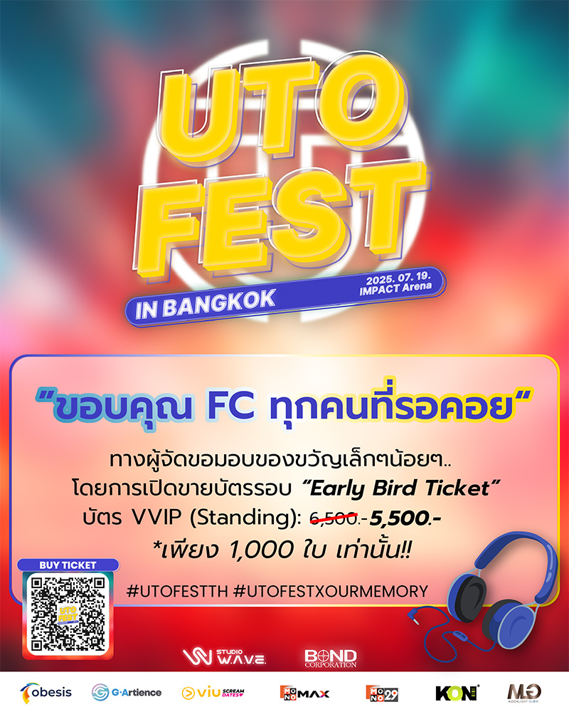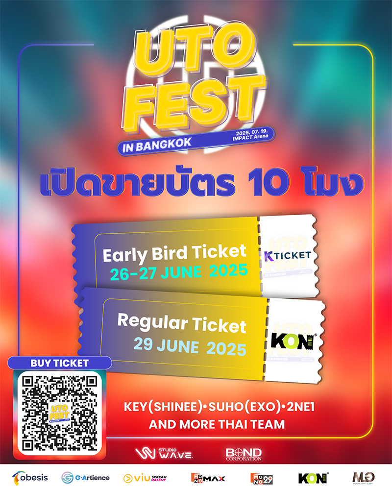 วอร์มนิ้วให้พร้อม กดบัตรแล้วมาเจอกันกับศิลปินชื่อดังที่คิดถึง SUHO (EXO), KEY (SHINee), 2NE1 และศิลปินเซอร์ไพร์สสุดฮอต กับปรากฏการณ์คอนเสิร์ตยิ่งใหญ่ที่จัดมาแล้วหลายประเทศใน 2025 UTO FEST IN BANGKOK วันเสาร์ที่ 19 กรกฎาคม 2568 ณ IMPACT Arena (อิมแพค อารีน่า) บัตรราคา (VVIP) 6500, (VIP) 5500, (GOLD) 4500, (SILVER) 3500 และ (BRONZE) 2000 บาท