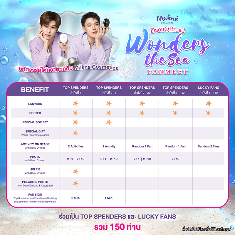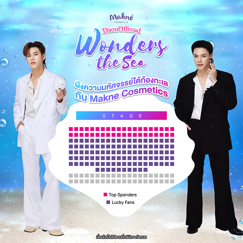 ทำเอาแฟนๆ ฟินไม่พัก เมื่อบริษัท คิวบิซ บิสซิเนส จำกัด ผู้ผลิตและจัดจำหน่ายผลิตภัณฑ์ “Makne Cosmetics” ประกาศจัดงาน “Makne Cosmetics x DaouOffroad Wonders the Sea FANMEET มหัศจรรย์ใต้ท้องทะเล” กำหนดจัดขึ้นในวันที่ 30 สิงหาคม 2568 ที่ True Digital Park Grand Hall พร้อมจัดเต็ม! กิจกรรมสุดพิเศษที่เป็นมากกว่าแฟนมีตติ้ง กับ 2 พรีเซนเตอร์คู่จิ้นสุดน่ารักอย่าง “ต้าห์อู๋ พิทยา แซ่ฉั่ว” และ “ออฟโรด กันตภณ จินดาทวีผล” มาเสิร์ฟความฟินฉ่ำๆ ให้กับ Top Spenders 40 คนแรกที่ใช้จ่ายสูงสุด และ Lucky Fan 110 คน ลุ้นเป็นผู้โชคดีร่วมเปล่งประกายความสดใสใต้ท้องทะเลแบบ Exclusive Moment