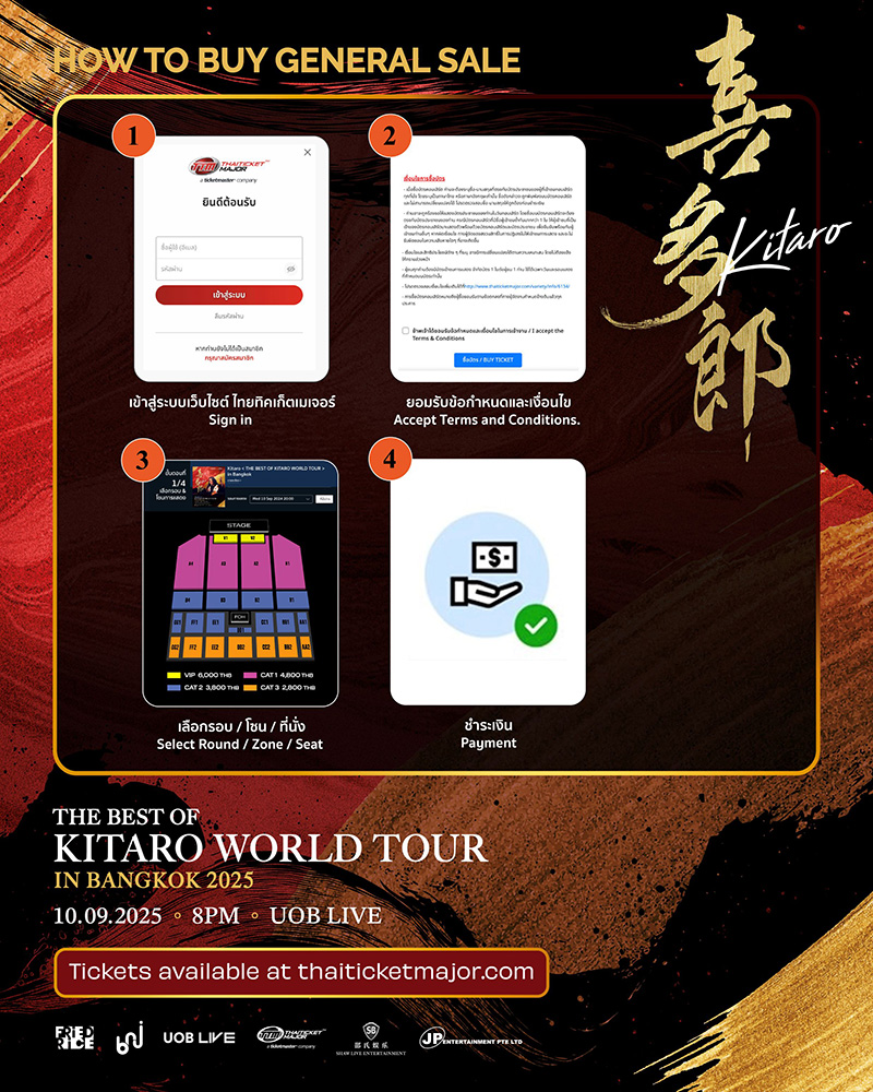 ผู้ถือบัตร UOB ในประเทศไทย สิงคโปร์ อินโดนีเซีย มาเลเซีย และเวียดนาม มีสิทธิ์ซื้อบัตรก่อนใคร โดยรอบพรีเซล UOB จะเปิดตั้งแต่วันที่ 29 กรกฎาคม 2568 เวลา 10:00 น. – 23:59 น. (เวลาไทย) การขายบัตรรอบทั่วไปสำหรับ THE BEST OF KITARO WORLD TOUR IN BANGKOK 2025 จะเริ่มวันที่ 30 กรกฎาคม 2568 เวลา 10:00 น. ผ่านเว็บไซต์ ThaiTicketMajor.com