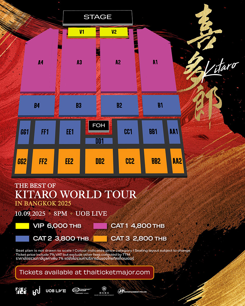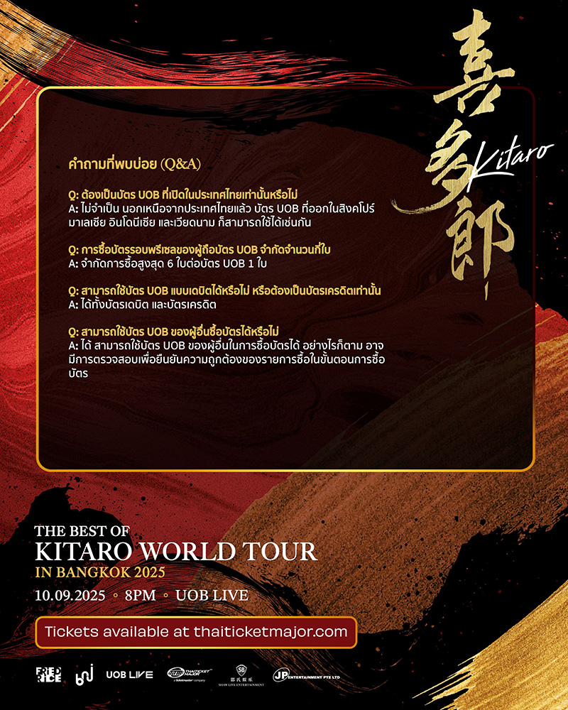 ด้วยบทเพลงที่เปี่ยมด้วยสารแห่งสันติภาพ ความเป็นหนึ่งเดียว เตรียมกลับมามอบประสบการณ์ความประทับใจทางดนตรีอันลึกซึ้งอีกครั้งในประเทศไทยหลังจากห่างหายไปนานถึง 8 ปี กับคอนเสิร์ตเต็มรูปแบบภายใต้ชื่อ “THE BEST OF KITARO WORLD TOUR IN BANGKOK 2025” โดยความร่วมมือของ FriedRice Entertainment, BNJ Entertainment, Shaw Brothers Live Entertainment และ JP Entertainment โดยจะจัดขึ้นในวันพุธที่ 10 กันยายน 2568 เวลา 20:00 น. ณ UOB LIVE (ชั้น 6 ศูนย์การค้า EMSPHERE กรุงเทพฯ)
