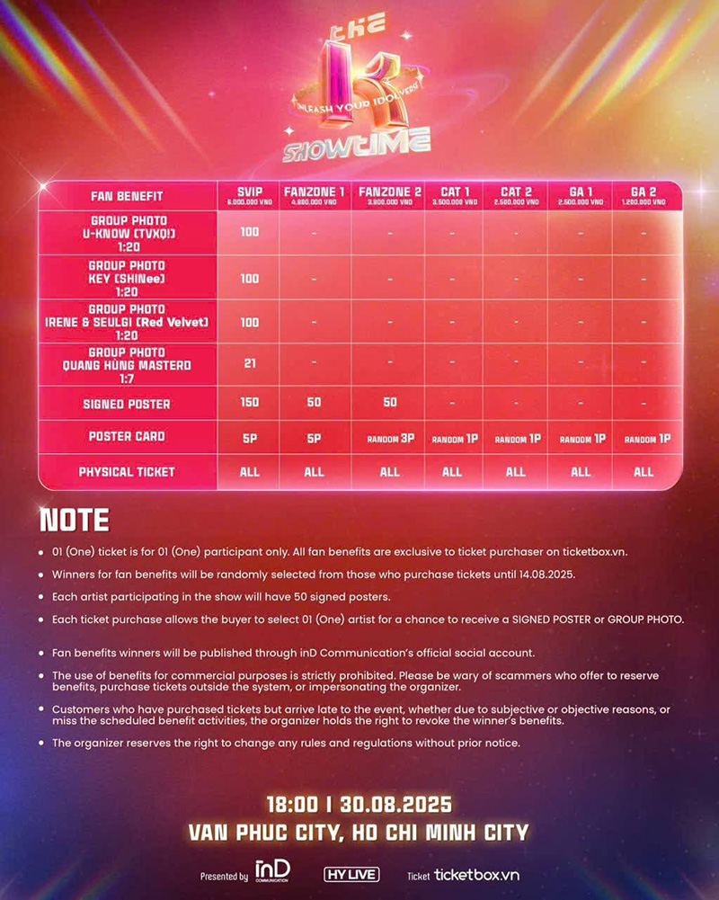 สำหรับงาน THE K-SHOWTIME จะจัดขึ้นในวันเสาร์ที่ 30 สิงหาคม 2025 จำหน่ายในวันเสาร์ที่ 2 สิงหาคม 2025 เวลา 10.00 น. ทาง https://ticketbox.vn/the-k-showtime-24648