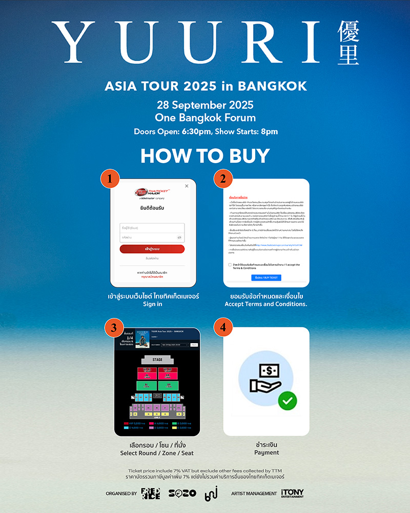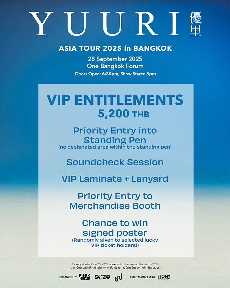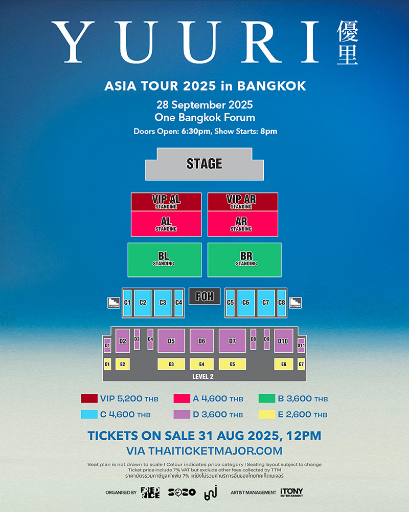 การจำหน่ายบัตรสำหรับงาน YUURI Asia Tour 2025 – Bangkok จะเริ่มขึ้นในวันที่ 31 สิงหาคม 2025 เวลา 12:00 น. (ตามเวลาประเทศไทย) ผ่านทาง thaiticketmajor.com