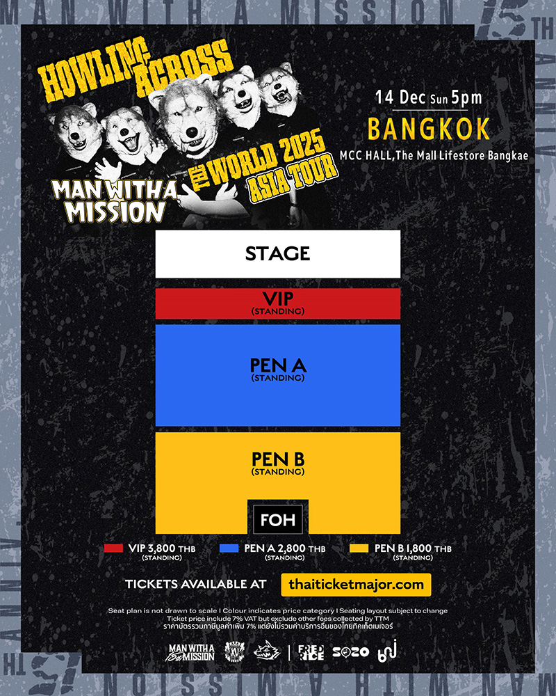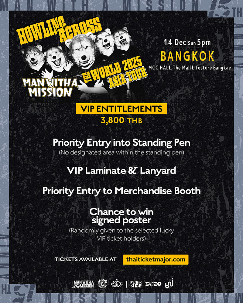บัตรคอนเสิร์ต MAN WITH A MISSION “HOWLING ACROSS THE WORLD 2025 – ASIA TOUR” in BANGKOK จะเปิดจำหน่ายทั่วไปในวันที่ 31 สิงหาคม 2568 เวลา 14:00 น. ผ่านทาง thaiticketmajor.com