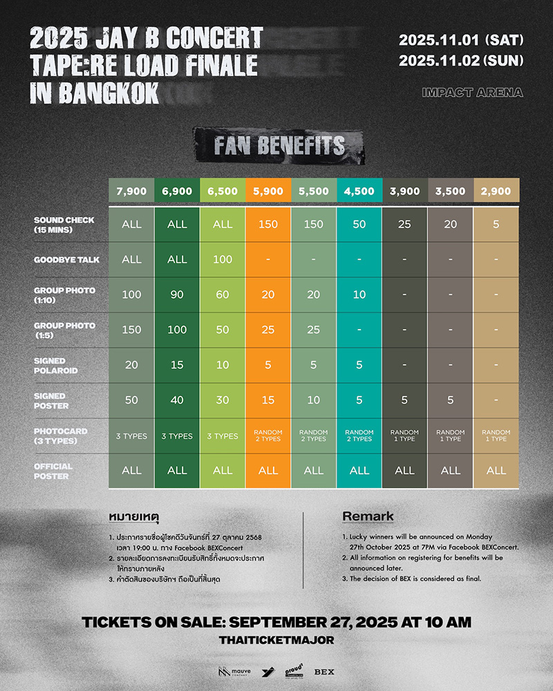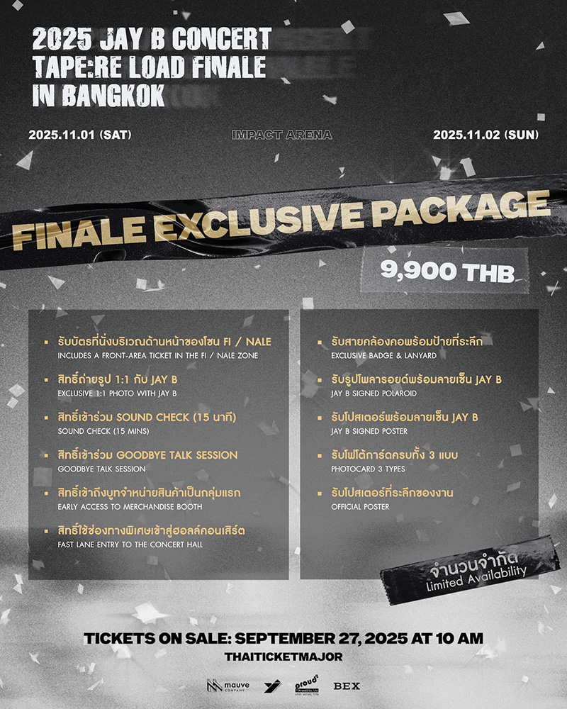 เตรียมกรี๊ดให้สุดเสียง! “JAY B” (เจบี) ศิลปินมากความสามารถแห่ง MAUVE Company กลับมาเสิร์ฟความฟินให้กับอากาเซ่ชาวไทยอีกครั้ง กับคอนเสิร์ตเต็มรูปแบบ 2025 JAY B CONCERT [TAPE:RE LOAD FINALE] IN BANGKOK เจบีลีดเดอร์คนเก่งพร้อมมอบ “ความพิเศษ” ให้แฟน ๆ ชาวไทยอยู่เสมอในทุกครั้งที่ได้กลับมาเล่นคอนเสิร์ตที่บ้านหลังนี้ ซึ่งคอนเสิร์ตครั้งนี้เจบีไม่ได้มาเล่น ๆ เพราะเตรียมมอบประสบการณ์สุดพิเศษที่ “ใกล้” และ “เข้าถึง” กว่าเดิม พร้อมด้วยโชว์คุณภาพระดับอินเตอร์ แสง สี เสียง และโปรดักชันสุดอลังการที่ไม่เคยทำให้แฟน ๆ ต้องผิดหวัง งานนี้ยังได้ทีมผู้จัดคอนเสิร์ตมือโปรที่เจบีไว้วางใจมาโดยตลอดอย่าง BEX (บริษัทในเครือเวิร์คพอยท์กรุ๊ป) กลับมาร่วมงานอีกครั้ง พร้อมด้วย YJ PARTNERS และ PROUD2 จับมือร่วมผลิตโชว์สุดประทับใจ ที่การันตีว่าทุกวินาทีจะเต็มไปด้วย “เซอร์ไพรส์” และความทรงจำดี ๆ ระหว่างเจบีกับแฟน ๆ ชาวไทยอย่างแน่นอน
