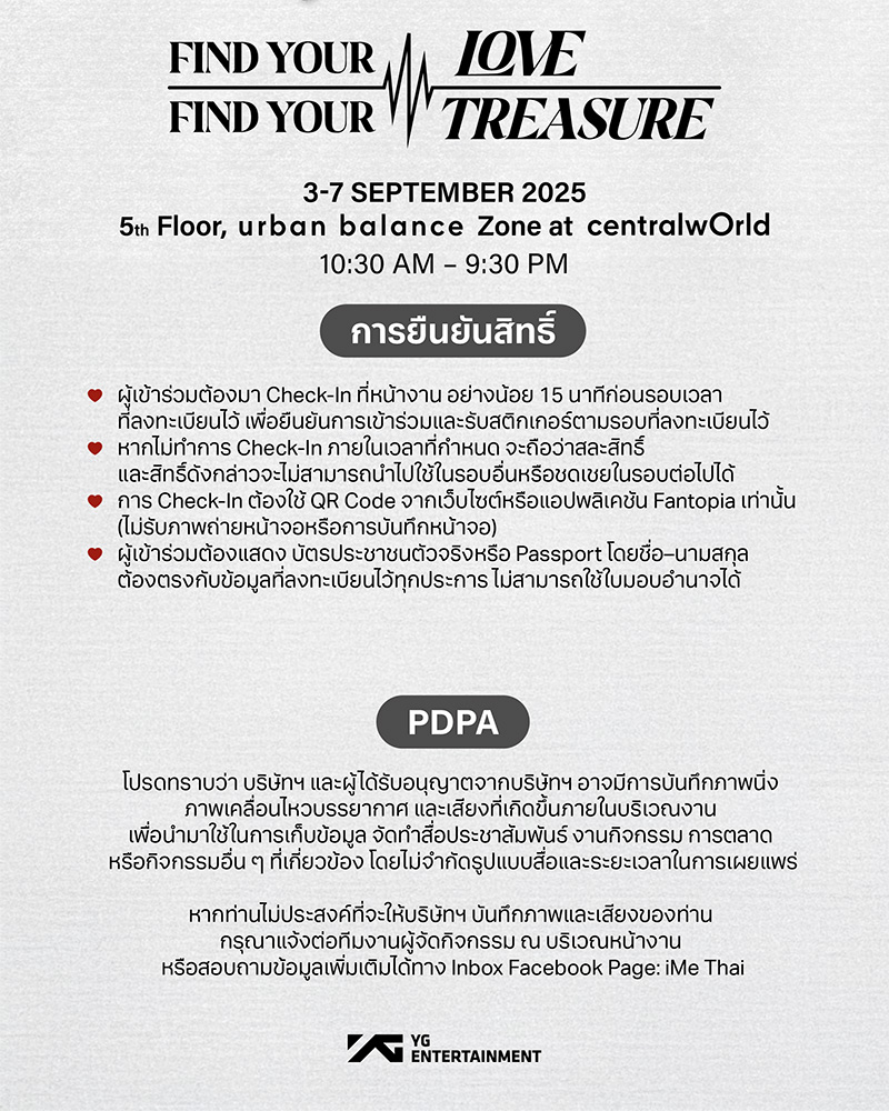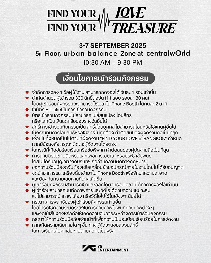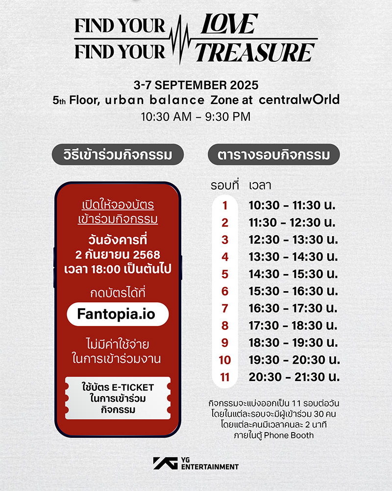 กลายเป็นพื้นที่สุดพิเศษ สำหรับทึเมชาวไทย โดยเตรียมยกความสนุกมาให้แฟนๆ ชาวไทยผ่านกิจกรรม FIND YOUR LOVE in BANGKOK ซึ่งประเทศไทยถูกชูสให้เป็นหนึ่งใน 3 ประเทศสุดพิเศษ ของการโปรโมท pop-up booth นอกเหนือจาก ประเทศเกาหลีใต้ และอินโดนีเซียด้วย โดยงานที่ประเทศไทยจะจัดขึ้นที่ ชั้น 5 โซน Urban Balance ศูนย์การค้าเซ็นทรัลเวิลด์ ที่เดียวเท่านั้น! ระหว่างวันที่ 3–7 กันยายนนี้ สำหรับงานนี้ทุกคนที่มาร่วมงานจะได้ โทรหา TREASURE แบบใกล้ชิด พร้อมรับ ของที่ระลึกสุดพิเศษ สำหรับผู้เข้าร่วมงานนี้ เข้าร่วมฟรี ไม่มีค่าใช้จ่าย หากต้องการร่วมกิจกรรม สามารถลงทะเบียนล่วงหน้าได้ที่ Fantopia.io นอกจากนี้แฟนๆ ยังสามารถมาชม และถ่ายภาพ TREASURE ได้จาก Digital Screen มากมาย ภายในศูนย์การค้าเซ็นทรัลเวิลด์ ตั้งแต่วันที่ 3-9 กันยายน 2568 บนจอ centralwOrld Digital Void Screen โซน Beacon, LED Main Entrance ด้านหน้าศูนย์การค้าฯและ LED Car Park ชั้น B1 อีกด้วย