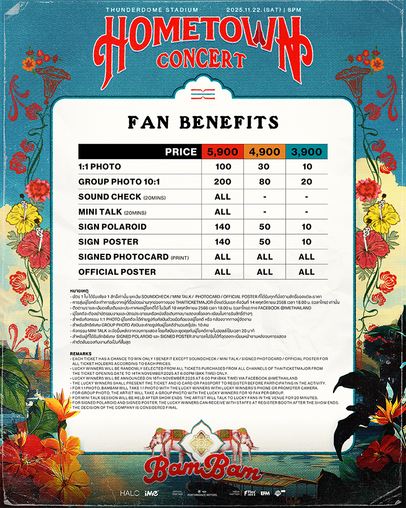 ความปังของ “แบมแบม” ไม่มีคำว่าถอย มีแต่พุ่งขึ้นเรื่อยๆ และในคอนเสิร์ตใหญ่ครั้งนี้เจ้าตัวก็ทุ่มเทสุดหัวใจ เพื่อมอบโชว์ที่ดีที่สุดให้กับแฟนๆ ในบ้านเกิดที่เขารักที่สุด “HOMETOWN” ที่มีความทรงจำ ความผูกพัน และผู้คนที่รักแบมแบมอย่างล้นหลาม! แฟนคลับห้ามพลาดมาเป็นส่วนหนึ่งของ “2025 BamBam HOMETOWN Concert in Bangkok” เพราะอะไรที่คุณคิดว่าอาจจะไม่มี อาจจะมีมากกว่าที่คิด! อะไรที่คิดว่าจะไม่ได้เห็น เตรียมเห็นแบบจัดเต็ม! และเซอร์ไพรส์ที่ไม่คาดคิด อาจจะเกิดขึ้นเฉพาะที่นี่..ที่เดียวเท่านั้น!!