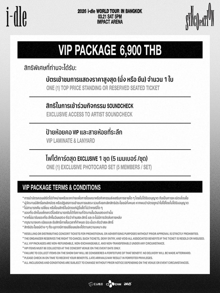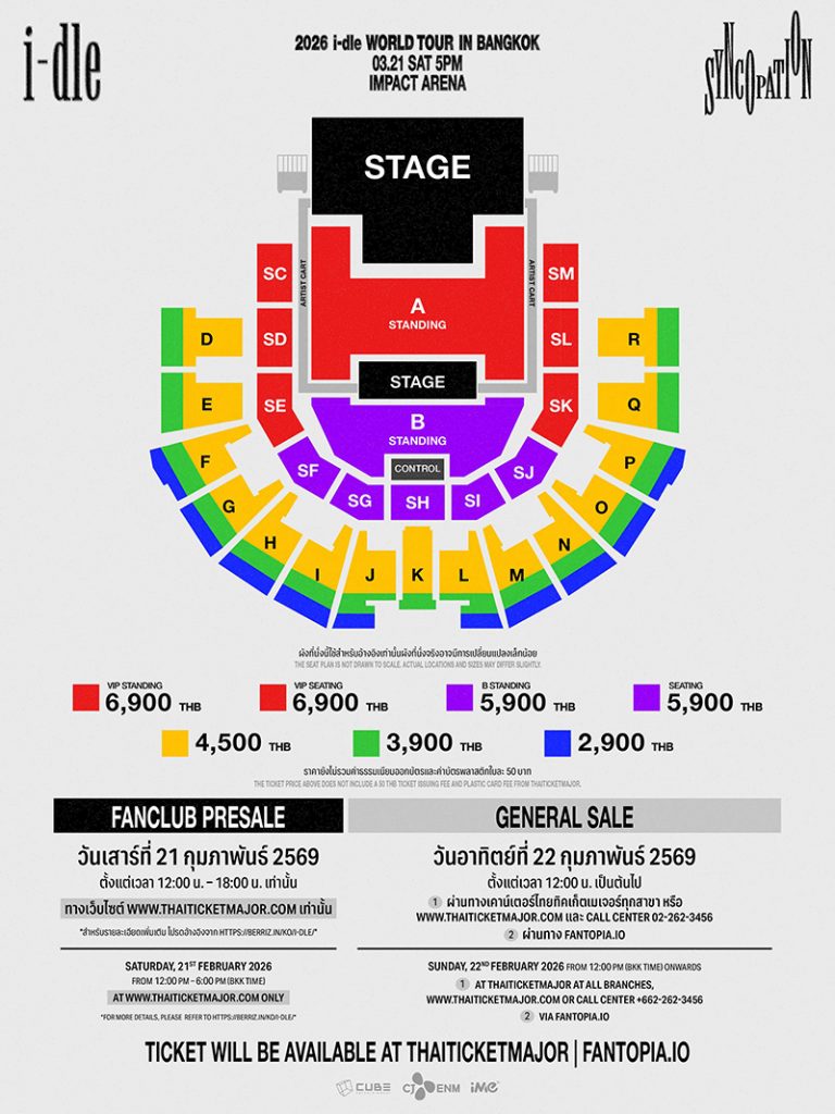 NEVERLAND ชาวไทย ล็อกคิวรอไปร่วมสร้างความทรงจำครั้งใหม่กับ i-dle ในคอนเสิร์ต 2026 i-dle WORLD TOUR [Syncopation] IN BANGKOK ไว้ได้เลย เปิดขายบัตรรอบ FANCLUB PRESALE วันเสาร์ที่ 21 กุมภาพันธ์ 2569 เวลา 12.00 – 18.00 น. ผ่านทาง www.thaiticketmajor.com เท่านั้น *เปิดจำหน่ายทุกโซน ทุกราคา ในจำนวนจำกัด* และเปิดขายบัตรรอบทั่วไปในวันอาทิตย์ที่ 22 กุมภาพันธ์ 2569 ตั้งแต่เวลา 12.00 น. เป็นต้นไป ผ่านทาง www.thaiticketmajor.com, เคาน์เตอร์ไทยทิกเก็ตเมเจอร์ทุกสาขา, Call Center 02-262-3456 *เปิดจำหน่ายทุกโซนยกเว้นโซน SE/SF/SJ/SK/D/E/R/Q* และผ่านทาง www.fantopia.io *จำหน่ายบัตรเฉพาะโซน SE/SF/SJ/SK/D/E/R/Q เท่านั้น** บัตรราคา VIP PACKAGE 6,900 (บัตรยืนและนั่ง) / 5,900 (บัตรยืนและนั่ง) / 4,500 / 3,900 และ 2,900 บาท พร้อมสิทธิพิเศษสุดเอ็กซ์คลูซีฟมากมาย ติดตามรายละเอียดเพิ่มเติมได้ที่ Facebook และ TikTok : @imethailand / X และ Instagram : @ime_th